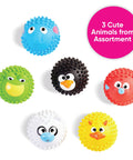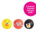 Each set of 3 Sensory Pals includes a surprise selection of animal-themed balls, featuring characters such as a frog, hedgehog, elephant, penguin, chick, or bear. These balls are sold fully inflated and can be re-inflated as needed.