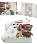 A thoughtfully designed newborn gift set featuring essential sensory and comfort items. Includes a cotton-bamboo swaddle with a secure button closure, a portable musical mobile with 22 minutes of melodies, a soft plush bear for tactile exploration, and a silicone teething ring with added textured teethers for teething relief. Packaged in a premium gift box, ideal for baby showers and gifting occasions.