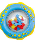 Vibrant circular rattle with different textures and patterns for baby to explore. Transparent centre is filled with assorted shapes that roll around the rattle when shaken, for engaging visual and auditory stimulation.