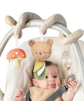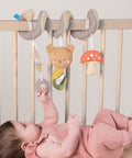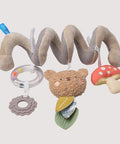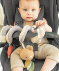 Fun and excitement for your baby on the go! The beautifully designed Bear Hugs Spiral is an entertaining accessory designed to easily attach to the car seat or pram handles using Velcro. The soft playful activity centre a soft Bear plus with bell, a ring rattle with teether, rattling mushroom rainbow two fabric leaves and a teether. Playing with the spirals hanging toys encourages the development of baby’s senses and motor skills. Suitable from birth.