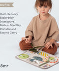 A versatile Montessori busy board that combines sensory play, motor skill development, and early learning - perfect for keeping toddlers entertained while fostering curiosity and independent problem-solving.