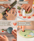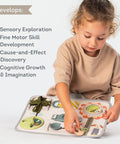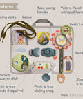 Interactive features: Includes laces with a peek-a-boo bear, rotating discover disk with peek-a-boo panda and squirrel, twist lock revealing a butterfly, central buckle, zipper with leaf, and sliding snap elements. Each activity is designed to engage toddlers while encouraging independent exploration.