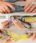 - Supports fine motor skills and dexterity through laces, buckles, twist locks, and sliding snaps