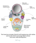 With the ability to adjust the angle of the activity centre, this fun filled toy can be used for babies right from the newborn stage, and can be adjusted as they grow. Featuring soft hanging toys with rattles and sounds, and cute characters from the Urban Garden Collection, this In Car Activity Centre makes a perfect gift for peaceful journeys for both baby and parent!