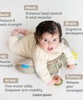 - Helps babies reach early milestones like rolling and pushing up
