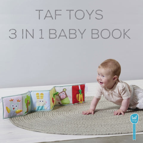 A versatile soft book designed to grow with infants through two developmental stages. Ideal for use in a cot, pram, or during tummy-time play.